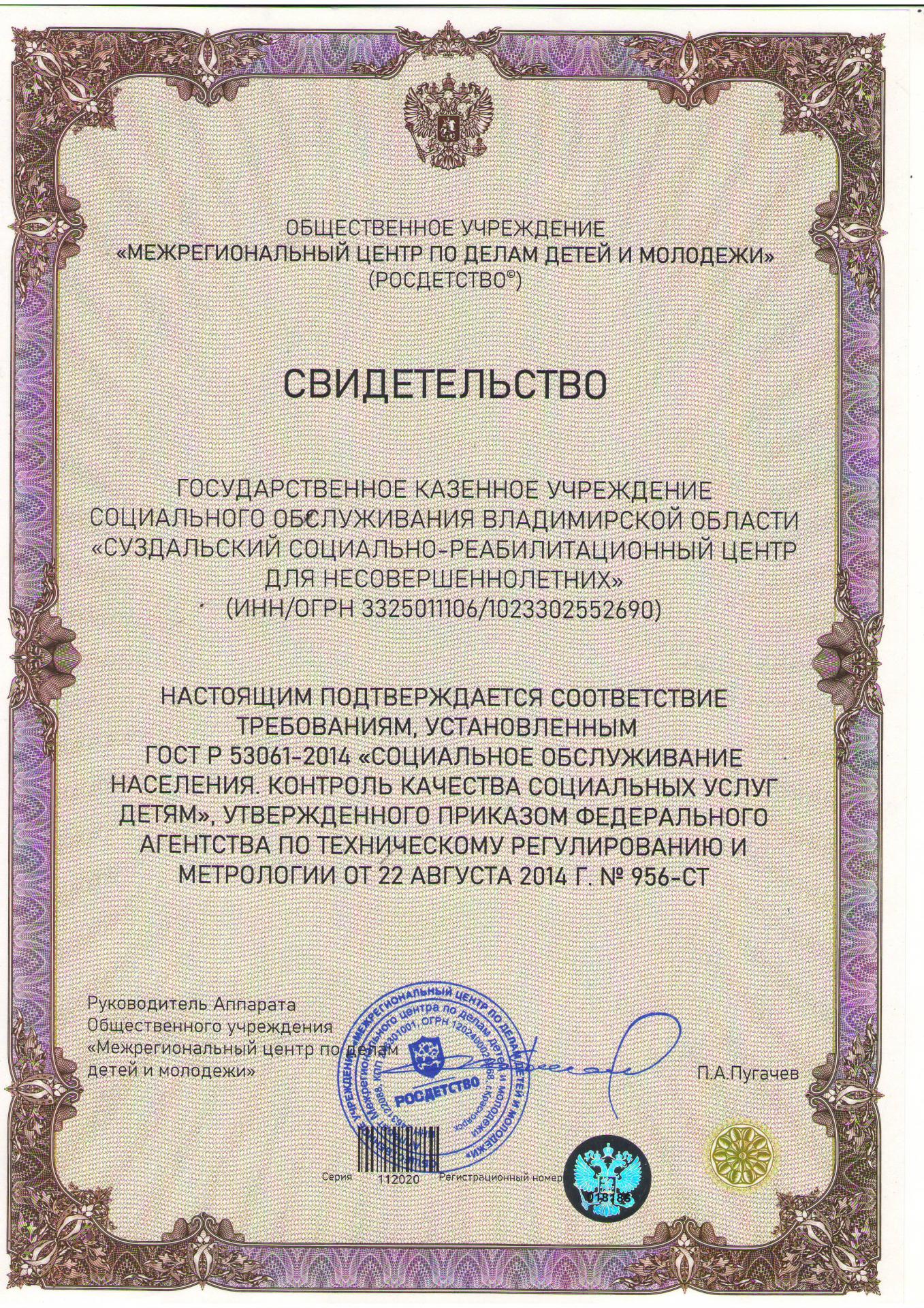 ГКУСО ВО «Суздальский социально-реабилитационный центр для несовершеннолетних» прошло экспертизу в рамках конкурсного отбора на присуждение Национальной общественной премии «Российские организации дружественные к детям». Учреждение получило свидетельство о соответствии требованиям государственному стандарту «Социальное обслуживание населения. Контроль качества социальных услуг детям».